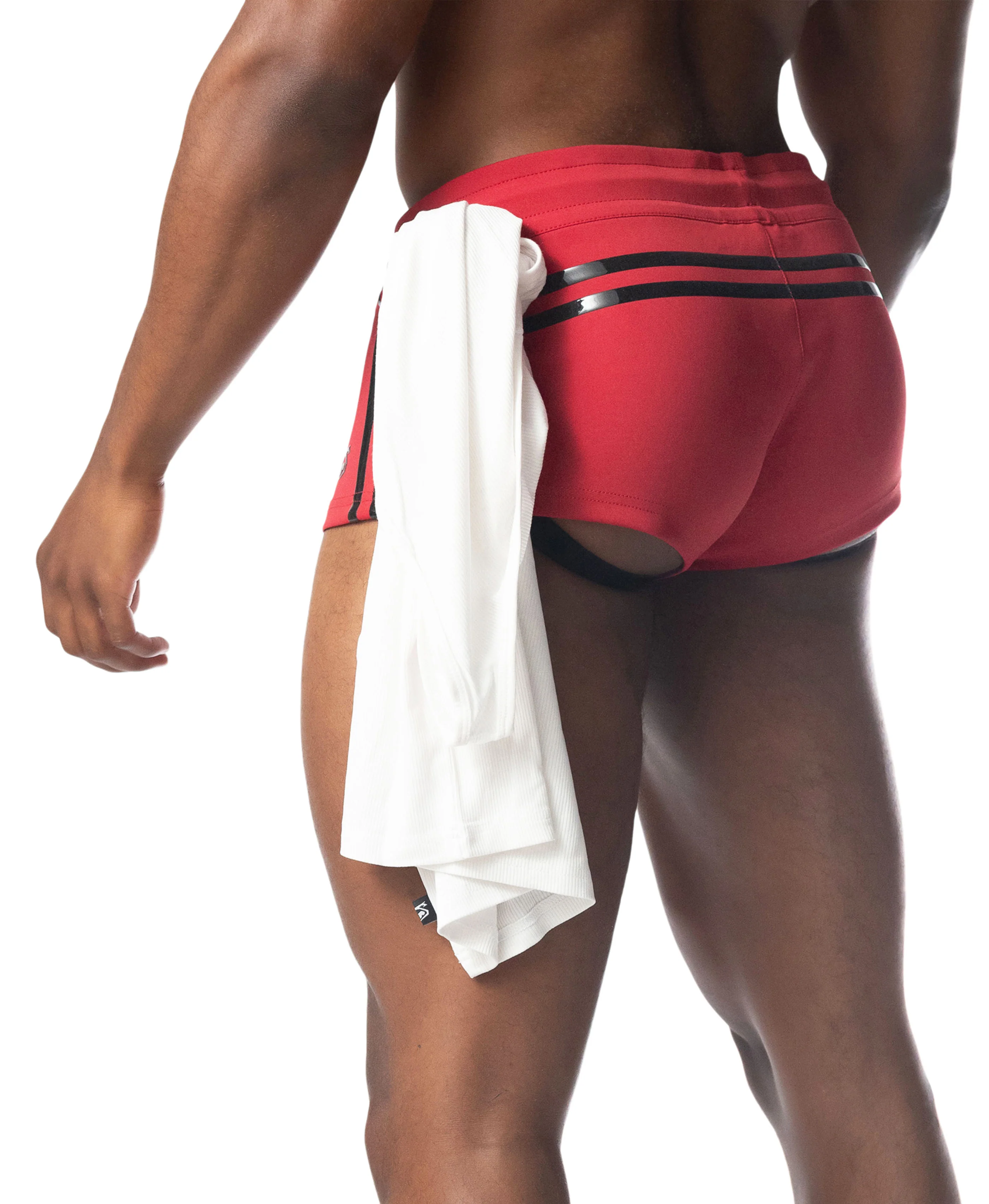 Equally at home at a club or an afters short. Built-in black elastic leg straps (mirrored on the top of the shorts on the back) give the effect of wearing a jock underneath while allowing for full VPL.
