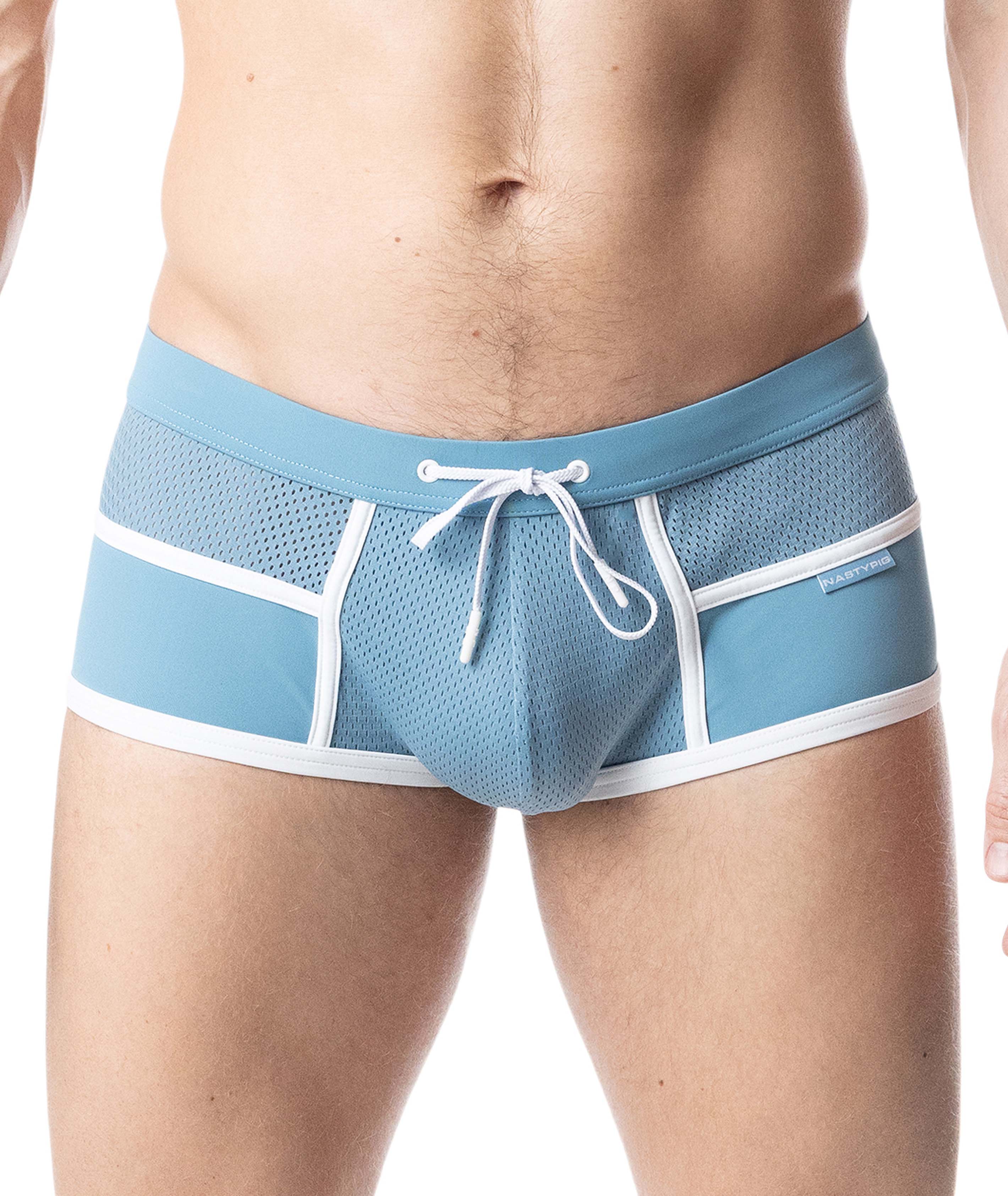 This square cut seems subtle, but only at first glance. The mesh panels across the leg and ass allow just enough skin to show through to turn heads at the pool party. A great staple for your swim collection.